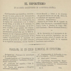 Durante la breve I República Española (1873-74) se escribió una hermosa página en la historia del espiritismo. En estos momentos históricos de libertades y aspiraciones de mejora social, el espiritismo se desarrollaba y era abrazado por numerosos hombres de ciencia y letras. De este modo, en el marco de la renovación pedagógica de la enseñanza, durante la primera legislatura de las Cortes Constituyentes, se presentó una enmienda al proyecto de ley sobre reforma de la segunda enseñanza y de las facultades de filosofía, letras y ciencias, en la que se proponía que el espiritismo formara parte de las materias de estudio.