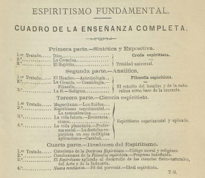 Y abundando todavía más, un año más tarde, en la misma publicación periódica, Almanaque del espiritismo de 1874, aparecía un cuadro más desarrollado de enseñanza completa del espiritismo fundamental firmado en este caso solo por Torres-Solanot (T.-S). Con todo, la coincidencia de la publicación de un cuadro sistemático de enseñanza en realidad es una prueba de la seriedad de la propuesta, que incluía aspectos teóricos sobre filosofía y experimentales.